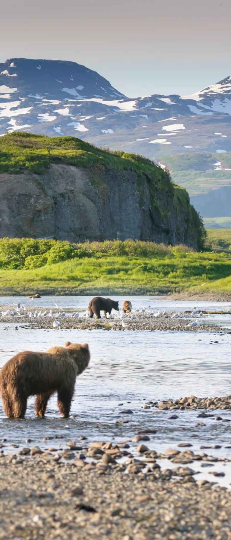 The McNeil River originates in the Aleutian Mountains and travels northeast to empty into Akumwarvik Bay in the lower Cook Inlet. The river offers prime fishing for bears due to a collection of rocks and boulders that make up McNeil River Falls. The falls’ pools and rapids slow down the salmon as they migrate upstream to spawn, making them easy targets for hungry brown bears.